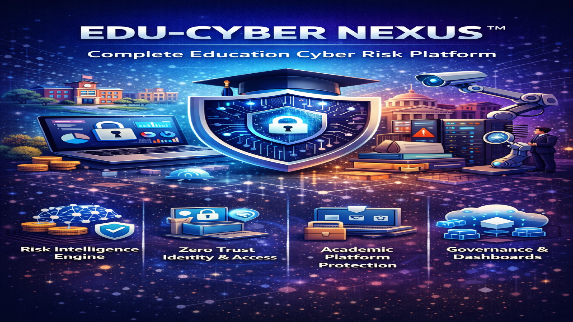 The Problem EDU-CYBER NEXUS™ Solves Educational institutions today face a unique cyber risk reality: Large volumes of student & academic data Multiple platforms: LMS, SIS, ERP, cloud, IoT Diverse users: students, faculty, staff, vendors Increasing regulatory pressure Low cyber maturity but high reputational risk Traditional security tools operate in silos. EDU-CYBER NEXUS™ delivers centralized intelligence, control, and visibility across the entire education business.