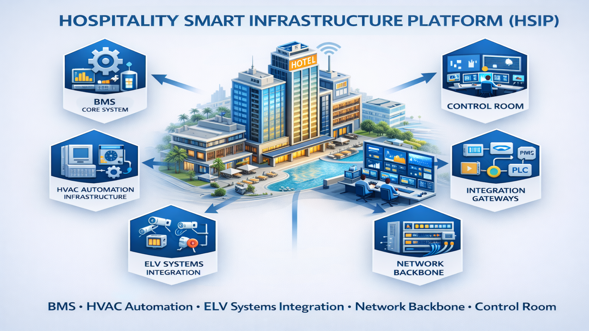 HSIP integrates Extra Low Voltage (ELV) systems into a unified infrastructure environment, enabling coordinated building operations. Integrated ELV Systems CCTV and video surveillance systems Access control and door management Fire alarm system interfacing Public Address and voice evacuation systems Structured cabling and signal distribution